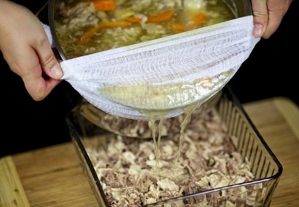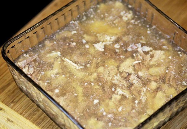 А у меня наоборот-я не люблю холодец,а муж обожает..и шоб пожирнее)))) я еще зелень в тарелочки с мясом выкладываю