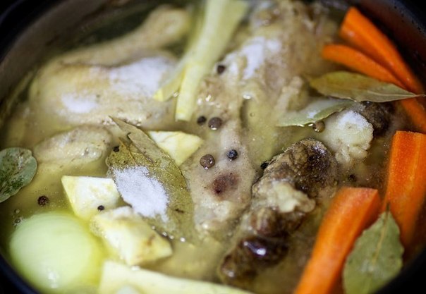 3. Очистите лук, корень сельдерея, морковь и корень петрушки. Проколите лук небольшим ножом в нескольких местах. Добавьте все овощи в кастрюлю с мясом. Положите лавровый лист, черный перец и душистый перец, посолите по вкусу (учитывая, что вода еще выкипит). Варите бульон еще в течение 1 часа, пока мясо не будет легко отделяться от костей.