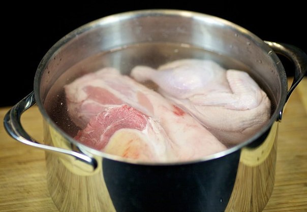 2. Положите мясо и курицу в кастрюлю, залейте кастрюлю водой и доведите до кипения. Когда вода закипит, слейте ее и добавьте свежую воду в таком количестве, чтобы она покрыла мясо. Поставьте кастрюлю с мясом на огонь, доведите до кипения, уменьшите огонь до минимума, накройте крышкой и варите 3 часа.
