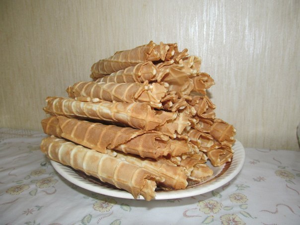 Горячие вафли скручивайте в трубочку.