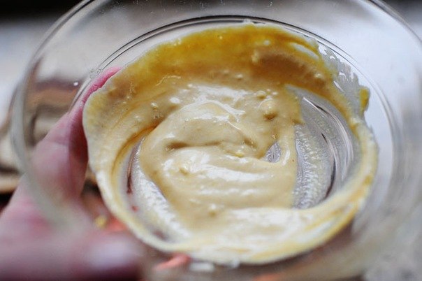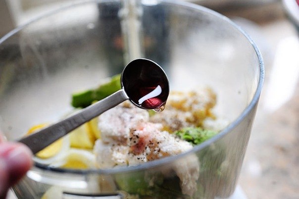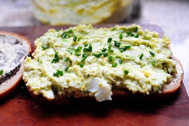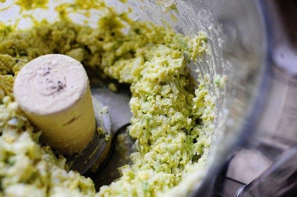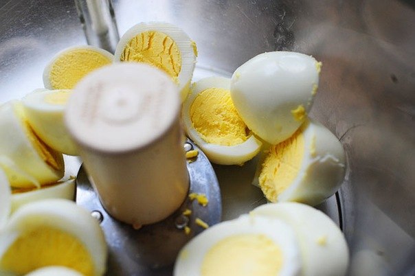 Варенные яйца разрежьте на 2 половины и закиньте в миксер (также можно размять вилкой в миске).