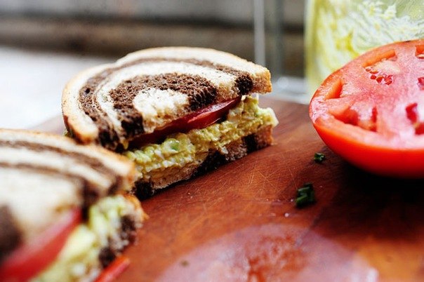 Чтобы получился сэндвич, разрежьте кусок хлеба на 2 части и на одну из них положите тонко нарезанное кольцо помидора.