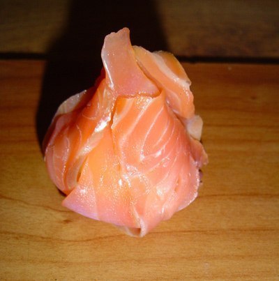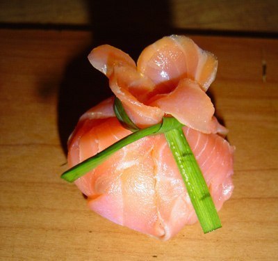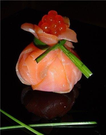 Мелко нарезаем листья чеснока(можно заменить перьями зеленого лука) и смешиваем с творожным сыром. Нарезаем рыбу тонкими пластинами(или берем готовую нарезку), выкладываем друг на друга три пластинки. В центр помещаем творожный сыр с чесноком и собираем концы рыбных пластинок в кулечек(рыба очень хорошо прилипает к сыру). Берем листик чеснока и завязываем наш «мешочек», а длинные концы листьев обрезаем. Расправляем концы рыбы и кладем в середину красную икру.Готово!