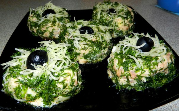 Рыбные консервы размять вилкой, смешать с мелко порезанной соленой рыбой и яйцом, капелькой Табаско, лимонным соком и творожным сыром. Укроп мелко порезать. Сформировать из рыбно-творожной массы шарики, обвалять их в укропе, украсить маслиной и тертым сыром. До подачи подержать в холодильнике.