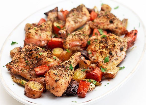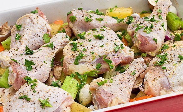 Духовку нагрейте до 220 градусов. Вымойте и нарежьте овощи. Выложите из в блюдо для запекания. Сбрызните оливковым маслом, уксусом, посолите и поперчите. Выложите сухие травы. Сбрызните ножки и бедрышки оливковым маслом, посолите и поперчите. Выложите на овощи и запекайте около часа до готовности курицы. Достаньте курицу из блюда, перемешайте овощи и подержите в духовке еще 5-10 минут. Остудите и подавайте. Подавайте со свежем петрушкой.