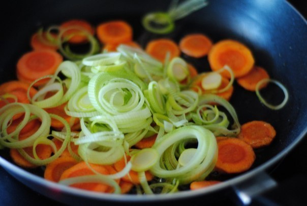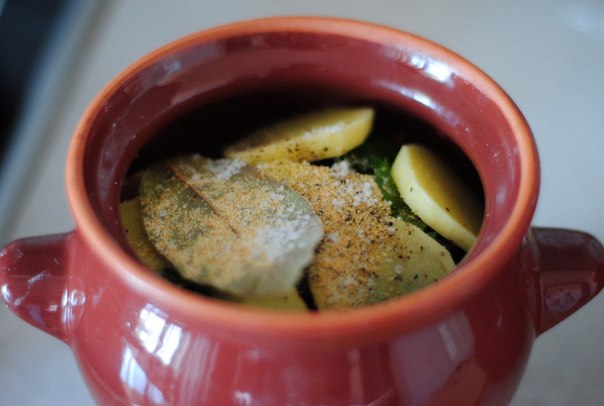 Перво-наперво горшочки нужно обдать кипятком. И налить в них бульон. Картофель нарезать круглыми тонкими дольками. Бедра разделить на порционные кусочки (косточки оставить). Лук порей обжарить с морковкой. Помидорки разрезать на четвертинки, чернослив-пополам. Мелко порубить зелень. Чеснок раздавить ребром ножа. Теперь укладываем все ингредиенты в горшочек. Сначала картофель, затем мясо, на мясо — лук с морковкой, затем помидорки, чеснок, чернослив и зелень. На самый верх несколько ломтиков картофеля и специи.