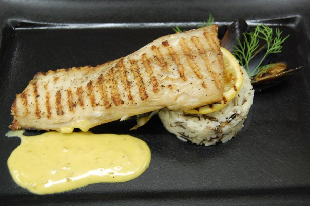 Рыбу разбирают на чистое филе, солят, перчат и обжаривают на гриле. Отварной дикий рис смешивают с басмати(50/50), добавляют сливки, специи и выпаривают лишнюю влагу.